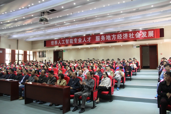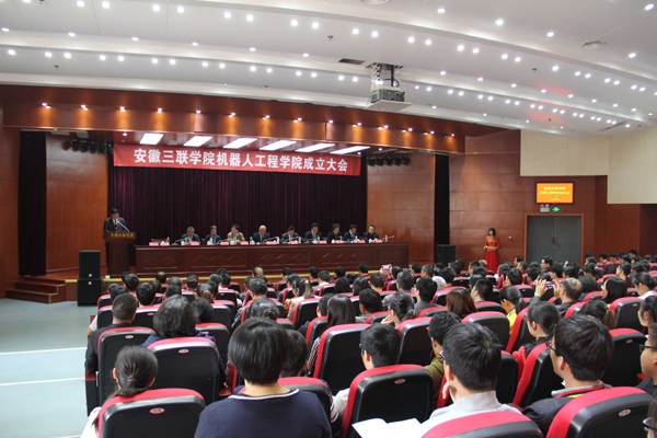 4月28日下午,安徽三联学院机器人工程学院成立大会暨揭牌仪式在校图书馆学术报告厅隆重举行,这也是我省首家成立“机器人工程学院”二级学院的高校。省经济和信息委员会信息产业推进处潘峰处长、中国科学技术大学杨杰教授、安徽三联机器人科技股份有限公司严维平副总经理等应邀出席大会,安徽三联学院校长金会庆教授等校党政领导,全校副处级及以上人员,计算机工程学院、电子电气工程学院、机械工程学院、机器人工程学院部分教师、辅导员和学生代表参加大会,大会由校党委副书记鲁先长主持。