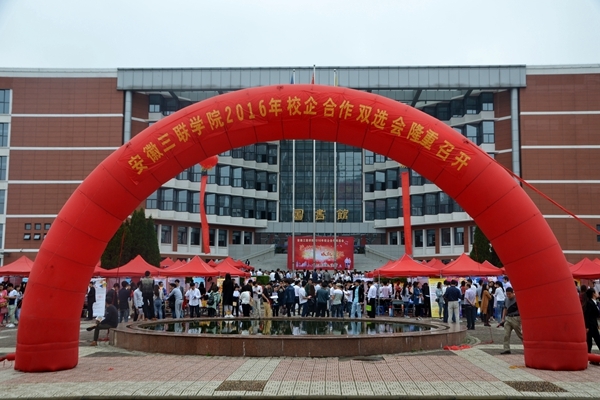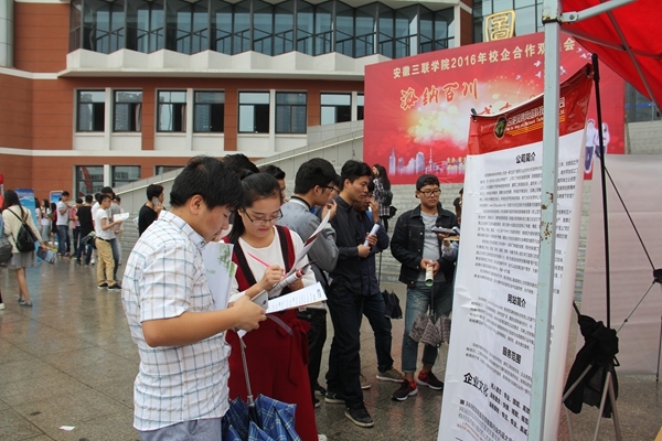 6月3日,安徽三联学院2016年校企合作双选会在图书馆前广场成功举办。来自我校2016届本专科毕业生、符合条件的本专科实习生、以及合肥财经职业技术学院、安徽绿海商务职业学院部分毕业生参加了招聘会。安徽省大中专毕业生就业指导中心主任鲍勇莅临指导工作。