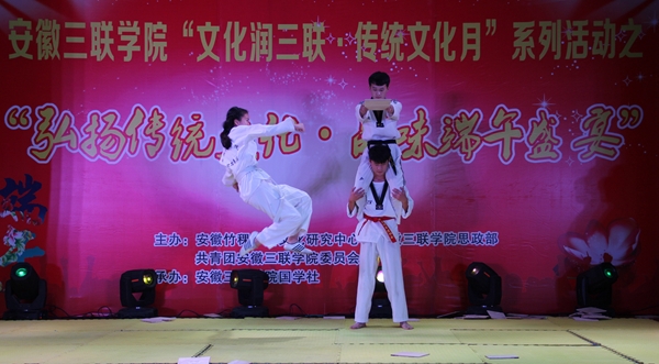“五月莺歌燕舞时,又见门畔菖蒲青。”随着国学社成立仪式的圆满成功,“弘扬传统文化·品味端午盛宴”晚会拉开序幕。舞蹈《礼仪之邦》在优美的舞姿中诉说着中华礼仪文化的精深;一首意境悠远、飘渺如天籁的《千年风雅》陶笛演奏给人以心灵上的共鸣;欢快轻松的吉他弹唱实现了传统与现代的完美结合;慷慨激昂的《少年中国说》诵读展现了三联学子的青春活力;一幅幅气势磅礴的书法作品展示更是让人叹为观止;《悸动跆风》武术表演不仅带给大家视觉上的震撼,更是传达着中华武术的魅力。除了一系列传统文化节目之外,还有精彩的相声、魔术表演等,为整场晚会赢得了更多的掌声和笑声,现场还穿插了“端午知识小竞答”、“送端午小礼品”等互动环节,精彩的传统文化盛宴在一片欢声笑语中圆满落幕。