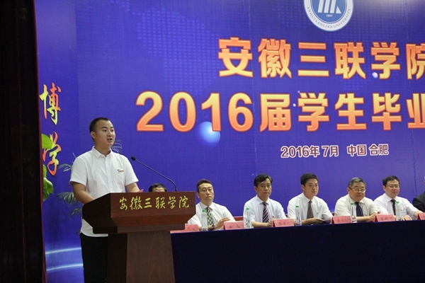 毕业生代表机械工程学院左振兴同学分享了自己三年大学时光里的点点滴滴,对母校领导和老师的关心与帮助表达由衷的感谢,表示在未来的生活中将以饱满的激情,以三联学子特有的姿态,去投身社会,服务社会,奉献青春,实现自我。
