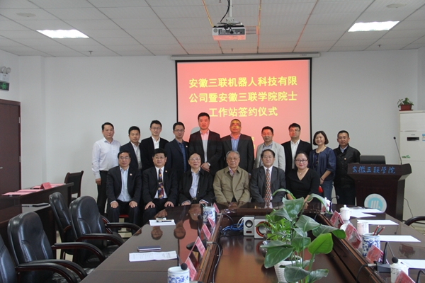 签约仪式上,校长助理操晓峰首先向专家团一行汇报了学校的基本情况,对我校的学科专业、办学定位、人才培养模式和学校办学特色等进行逐一介绍。随后由薛永祺院士与校党委副书记鲁先长、机器人公司总经理梅珑举行安徽三联机器人科技有限公司暨安徽三联学院院士工作站的签约。仪式后,与会人员合影留念。薛永祺院士在最后的讲话中说到,他对金会庆校长致予崇高的敬意,对我校的办学情况和发展成果表示认可,指出在当下中国经济增长的关键时刻,我校走产学研结合的办学模式对国家发展具有重要价值。