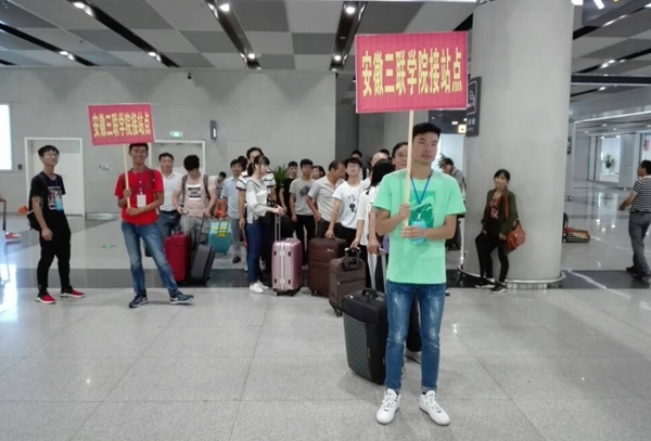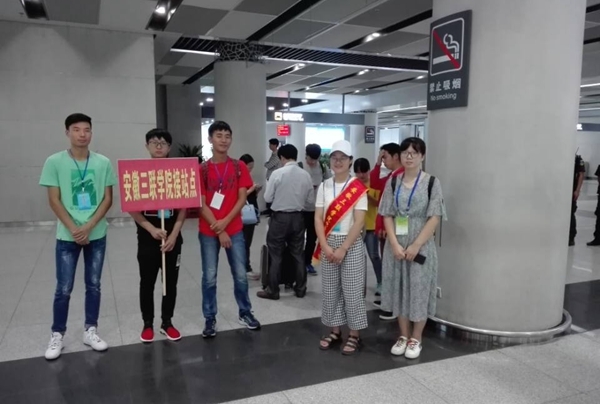 我校为了更好的迎接新生,为新生提供便捷。在校内安排志愿者的同时,也在校外各大车站安排了志愿者迎新。他们或是在人流迅速更新的高铁站,或是在人潮拥挤的汽车站、火车站翘首以盼,只为在人群中寻找来三联的学子。不论是接待处、出站口、服务站还是上车处,都有高举"三联学院"引导牌的志愿者。各个站点处处可见他们忙碌的身影,同时也总能看到他们耐心的为新生和家长们答疑解惑。
