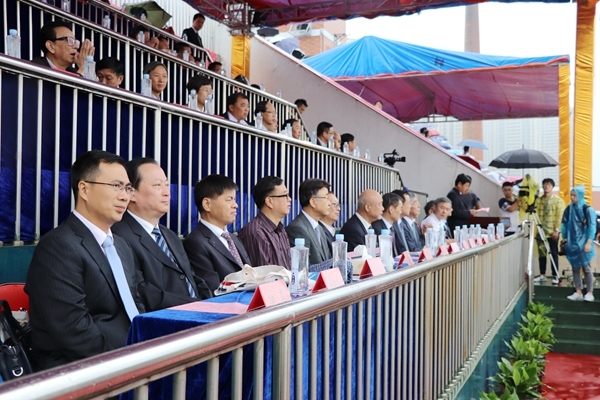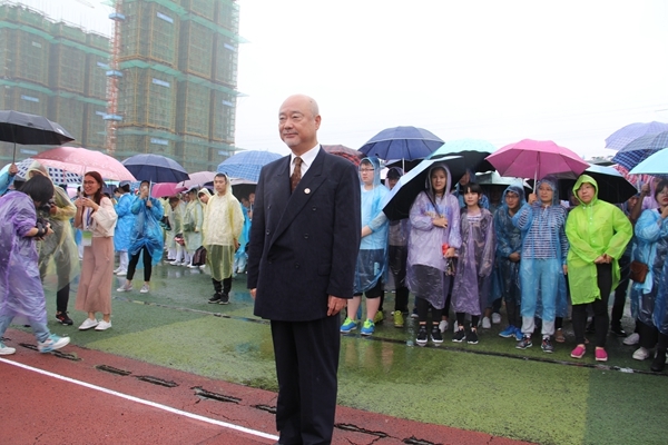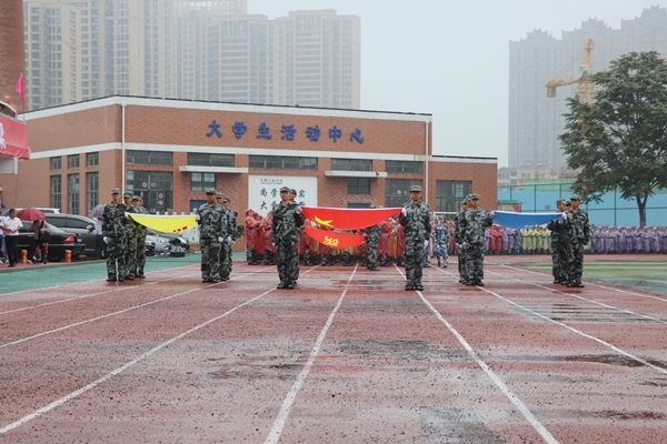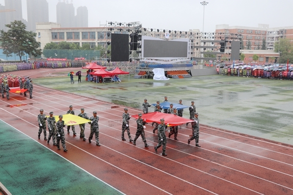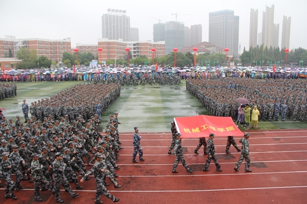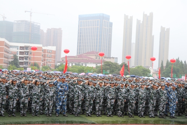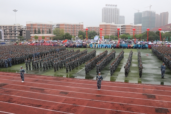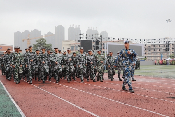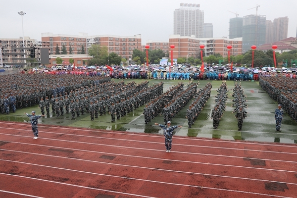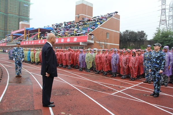 随后,安徽三联学院校长金会庆教授在副校长王瑞友的陪同下绕场一周检阅2017级新生军训队列,“同学们辛苦了”,毛毛细雨中金会庆校长饱含关切的慰问,体现了校长对广大学生的深深关爱。全体新生精神抖擞、士气高涨,“为祖国争光”,响亮豪迈的口号声、整齐的列队,展现出了全体新生良好的精神风貌。紧接着,2017级新生以分列式入场和健美操表演的形式进行了成果汇报,全场响起阵阵掌声。