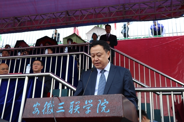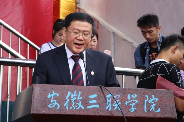 合肥学院党委书记蔡敬民教授代表兄弟院校致辞。蔡敬民书记首先代表出席庆典仪式的兄弟院校、代表合肥学院的全体师生员工,向安徽三联学院20周年校庆表示热烈祝贺,向参加庆祝活动的海内外嘉宾致以崇高的敬意。他表示,作为安徽省第一所民办高校,安徽三联学院的创立开启了安徽省民办高校的先河,完善了我省高等教育体系。20年来致力于为国家和社会培养高素质的应用型人才,走出了一条民办普通高等本科院校的特色发展之路,为促进区域乃至全国经济社会发展谱写了壮美华章。值此隆重庆典之际,蔡书记衷心希望两校进一步增进友谊,加强合作,携手并肩,共创辉煌!为中国高等教育事业的发展,为实现“两个一百年”的奋斗目标和中华民族的伟大复兴作出新的更大的贡献!