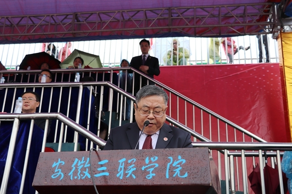 安徽三联学院校长金会庆教授发表重要讲话。金会庆校长首先代表学校,对各位领导和嘉宾的莅临表示最热烈的欢迎!向一直关心和支持学校事业发展的各级领导、各界朋友、广大校友表示最衷心的感谢!向长期以来为学校建设和发展做出积极贡献的全体三联人致以最崇高的敬意!他指出,安徽三联学院建校20年来,特别是2008年升格为本科高校以来,学校迎难而上,抢抓机遇,奋力拼搏,法人治理结构不断完善;思想政治教育工作不断强化;学科专业建设不断加强;人才培养质量不断提高;教科研平台建设不断突破;师资队伍质量不断提升;办学条件不断改善,学校各方面的工作取得了令人瞩目的成就。