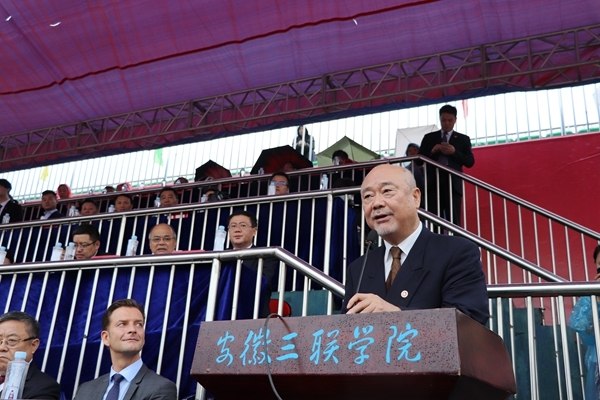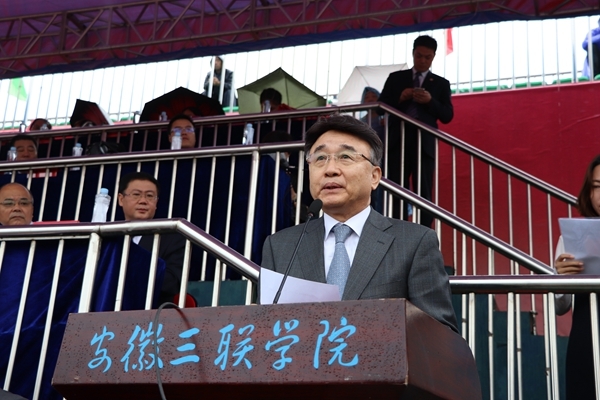 韩国培材大学校长金永浩教授代表国外合作院校致辞。金永浩校长指出,安徽三联学院坚持公益性的办学原则、坚持“生为本、师为根、质量促发展”的办学理念,令人钦佩。安徽三联学院是韩国培材大学的重要合作伙伴,随着两校的进一步深层次的交流与合作,必将培养出更多的国际化人才,期望安徽三联学院朝着金会庆校长建设“百年老校”的目标继续前行。