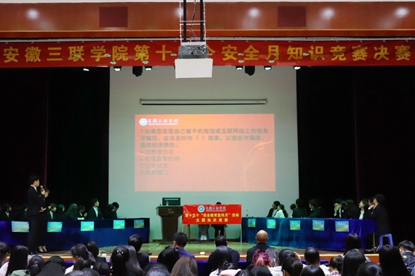 为全面普及校园安全知识,强化校园安全教育,积极营造校园安全文化氛围,3月29日,由共青团安徽三联学院委员会主办、安徽三联学院学生会承办的第十五个“安全教育宣传月”活动主题知识竞赛在我校图书馆报告厅拉开帷幕。校党委副书记鲁先长,校长助理蔡文芬,校党委委员李斌、占海文、宋梦岚,校团委负责人和各学院党、团总支书记,与在场300余人共同观看比赛。