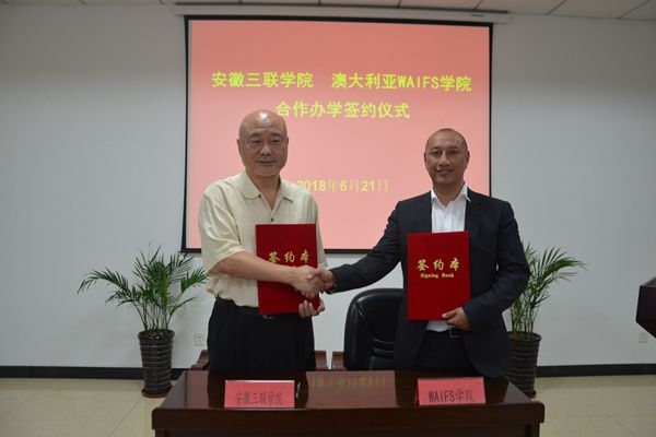 6月21日,澳大利亚WAIFS学院校长Sean一行4人来访我校,并在图书馆六楼会议室举行合作办学签约仪式。安徽三联学院校长金会庆教授,党委副书记鲁先长,副校长王瑞友、金哲和校长助理蔡文芬参加了签字仪式。