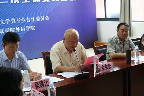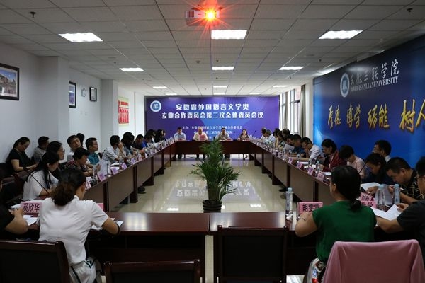 盛夏时节逢盛会,翡翠湖畔迎嘉宾。6月23日,安徽省外国语言文学类专业合作委员会(以下简称外合委)第二次全体委员会议在我校图书馆四楼会议室隆重召开。教育部大学英语教学指导委员会委员、外合委主任委员、安徽大学外国语学院朱跃教授,外合委副主任委员、安徽师范大学外国语学院院长张德让教授,外合委秘书长、安徽大学外国语学院胡健教授,外合委副秘书长、合肥师范学院外国语学院曹军教授,安徽三联学院校长金会庆教授,安徽三联学院校长助理兼教务处处长蔡文芬出席会议。来自全省35所本科高校的40名外语院系负责人参加会议。校长助理兼外语学院执行院长江秀丽博士主持了开幕仪式。