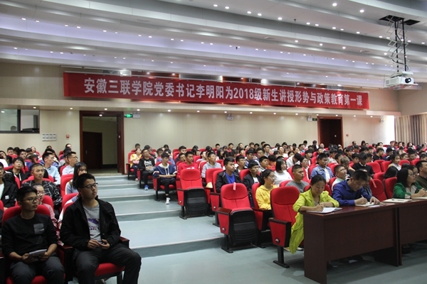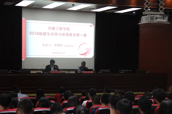 10月12日中午,省教育督导专员、校党委书记李明阳在图书馆学术报告厅为2018级新生讲授形势与政策第一课。本次报告会以“学而不厌”为主题,勉励三联学子坚定“四个自信”,弘扬中国传统文化,勇担青年使命。校党委副书记鲁先长主持报告会。