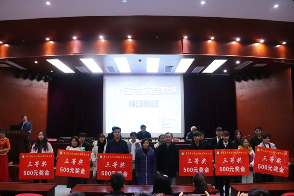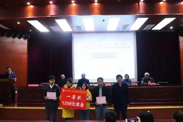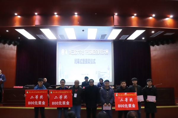 上午9:30大赛正式开始,合肥工业大学博士生导师陈无畏教授、机械工程学院院长吕新生教授、交通工程学院院长吴陵生教授等受邀担任大赛评委。本次大赛共收到来自省内合肥工业大学、安徽农业大学、合肥学院、安徽建筑工业大学等6所兄弟院校的50多组作品,经过大赛组委会对作品的初选、盲审等环节,最终遴选了30组作品进入决赛,被选入决赛的作品能够反映交通安全领域的新技术、新方法、新理论。通过答辩过程中的实物展示、模拟仿真、原理操作等环节,选手们相互观摩、相互学习、相互提高。下午16:00,大赛闭幕式在校图书馆学术报告厅举行,大赛产生1个一等奖、3个二等奖、6个三等奖。安徽三联学院党委副书记鲁先长、副校长王瑞友、校长助理蔡文芬、交通工程学院院长吴陵生、机械工程学院院长吕新生分别为获奖者颁发证书及奖金。鲁先长副书记代表大赛组委会作大赛总结讲话。