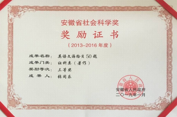近日,安徽省人民政府公布了我省哲学社科类最高且最权威的奖项获奖情况。我校外语学院张同乐教授的专著《英语文海拾贝50题》荣获2013-2016年度安徽省社会科学奖社科类(著作)三等奖,实现了我校哲学社会科学类科研成果省部级政府奖项的突破,也是科研反哺教学的重要表现。(撰稿、摄影:罗忠 编辑:隋欣)