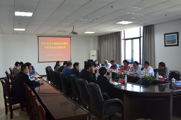 4月19日,由安徽省教育评估中心主任汪开寿担任组长的省民办高校年检组莅临我校开展2018年度检查工作。校董事长余皖生,省教育督导专员、校党委书记李明阳,校党委副书记鲁先长,校长助理操晓峰、蔡文芬,财务总监范兆红以及校党办、综合办、人事处、学生处等相关部门负责人参加检查活动。