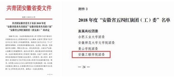 近日,共青团安徽省委发布表彰决定,授予共青团安徽三联学院委员会2018年度“安徽省五四红旗团委”称号。这是团省委授予我省共青团组织的最高荣誉,也是我校首次获此殊荣,2018年度全省仅有4个高校团组织获评此荣誉称号,我校是民办高校唯一。