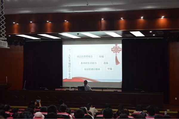“如何实现幸福?”路教授指出实现幸福的四个条件:一个健康的自我、一份称手的职业、一个美满的家庭、一帮靠谱的朋友。最后他总结三个支点是幸福大厦的的支柱和骨架,四个条件是构成大厦的环境,作为大厦无论是条件或是支点,都需要个体的努力奋斗才可能拥有,鼓励大家幸福都是奋斗出来的,指明了奋斗的方向。