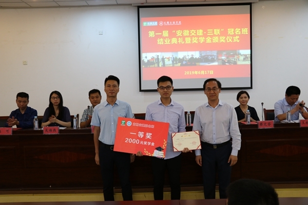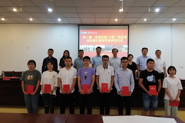 “安徽交建-三联”冠名班由安徽交通建设股份有限公司与我校交通工程学院合作成立,由2016级交通工程、安全工程本科专业的学生经过考试、面试选拔组建成班。自2018年下半年开班以来,采用校企双方共同制定人才培养方案、校企共管班级、企业专家来校授课、赴企业工程项目见习等人才培养形式,于今年6月初进行了结班考核与面试选拔,对成绩优异的学生颁发了一、二、三等奖学金,同时给全体冠名班学生发放了学习纪念品。