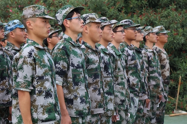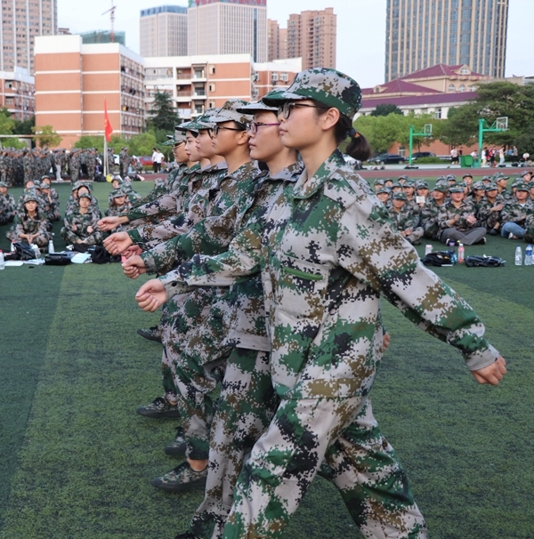 站军姿、齐步正步走等对19级学子来说成了家常便饭。在烈阳下他们没有丝毫松懈,青春的脸上看到的是坚毅的目光,汗水顺着帽檐、衣袖滴下,他们也绝不轻易放弃。