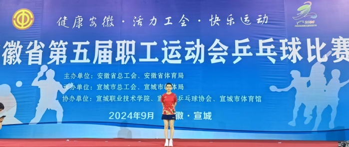 9月23日,安徽省第五届职工运动会乒乓球比赛在宣城圆满落幕。本次赛事分为青年男子、女子组个人赛和团体赛,中年男子、女子组个人赛和团体赛等8个竞赛项目。我校体育部教师杨可心代表合肥总工会参赛,经多轮激烈角逐,最终携手队友荣获团体赛冠军。