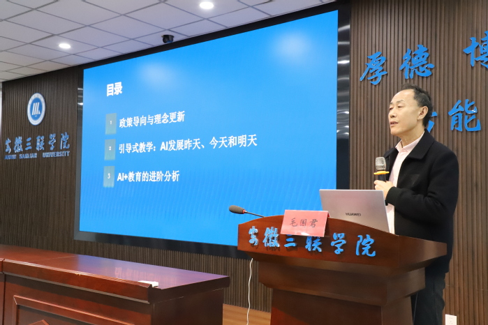 为深入贯彻国家教育数字化战略行动,提升管理干部的数字素养与智能化治理能力,11月8日下午,我校在B01学术报告厅成功举办《智启未来:AI演进与教育赋能》专题讲座。三联创始人金会庆教授,在肥校领导及中层管理干部参加培训,讲座由副校长洪梅主持。