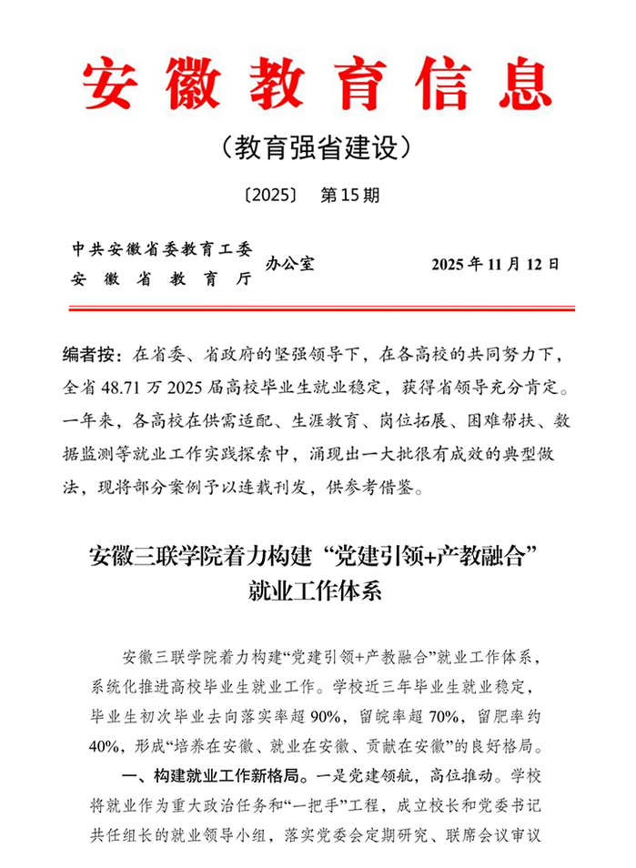 近日,我校“党建引领+产教融合”就业工作案例在《安徽教育信息(教育强省建设)》2025年第15期刊发。作为扎根安徽的首所民办高校,学校立足区域发展需求,破解就业结构性矛盾,走出了一条具有民办特色的就业育人新路径。