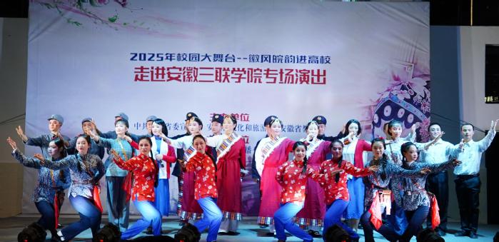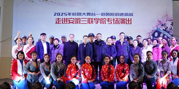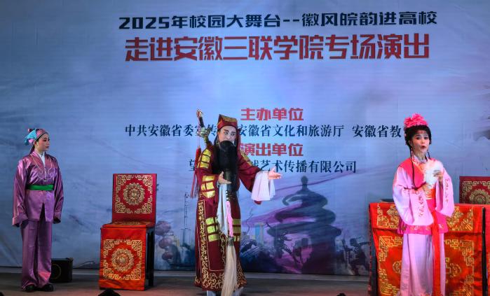 近日,由中共安徽省委宣传部、安徽省教育厅及安徽省文化和旅游厅联合主办,望江县黄梅戏艺术传播有限公司承办的2025年“徽风皖韵”进校园文化巡演活动在我校大学生活动中心圆满举办。副校长傅炜、潘涛,党办、图书馆、国际合作交流中心等部门负责人,三院三部学管主任、分团委书记及400余名师生代表共同观看了这场传统戏曲文化盛宴。