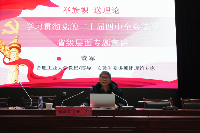 1月9日下午,学校在图书馆学术报告厅开展“举旗帜 送理论”学习贯彻党的二十届四中全会精神省级层面专题宣讲会。省委讲师团理论宣讲专家库成员、合肥工业大学马克思主义学院教授董军受邀作专题辅导报告,学校党委委员、副校长蔡文芬主持会议。