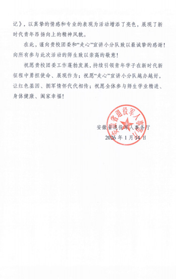 此次获赠感谢信,是荣誉更是责任。学校将以此为契机,持续深化红色育人实践,不断丰富拥军爱军活动载体,让红色基因代代相传,让拥军情怀融入校园血脉,引领广大青年学子以更加昂扬的姿态致敬英雄、学习典型,在新时代新征程中勇担使命、奋勇争先,为推动全社会拥军爱军氛围持续升温贡献三联智慧与青春力量!(撰稿、摄影:黄雅迪 编辑:夏孝登)