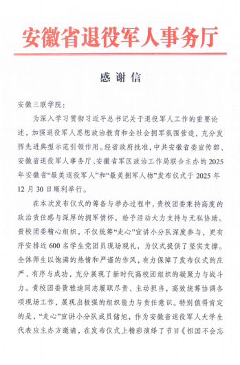 近日,安徽三联学院收到安徽省退役军人事务厅发来的感谢信,信中对学校在2025年安徽省“最美退役军人”和“最美拥军人物”发布仪式中给予的大力支持、作出的突出贡献给予高度赞誉,对参与活动的师生团队致以崇高敬意。这封沉甸甸的感谢信,既是对学校拥军工作与育人成效的充分肯定,更是对全体三联人传承红色基因、厚植拥军情怀的莫大鼓舞。