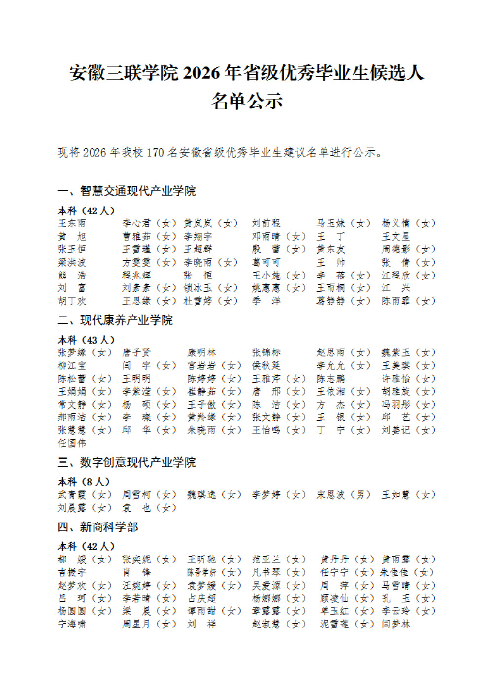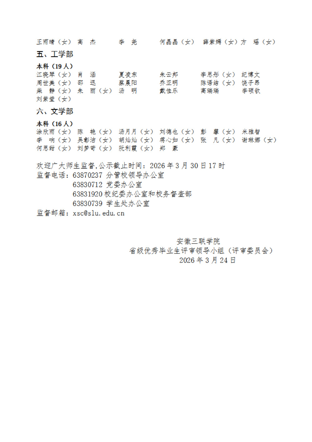 安徽三联学院2026年省级优秀毕业生候选人名单公示